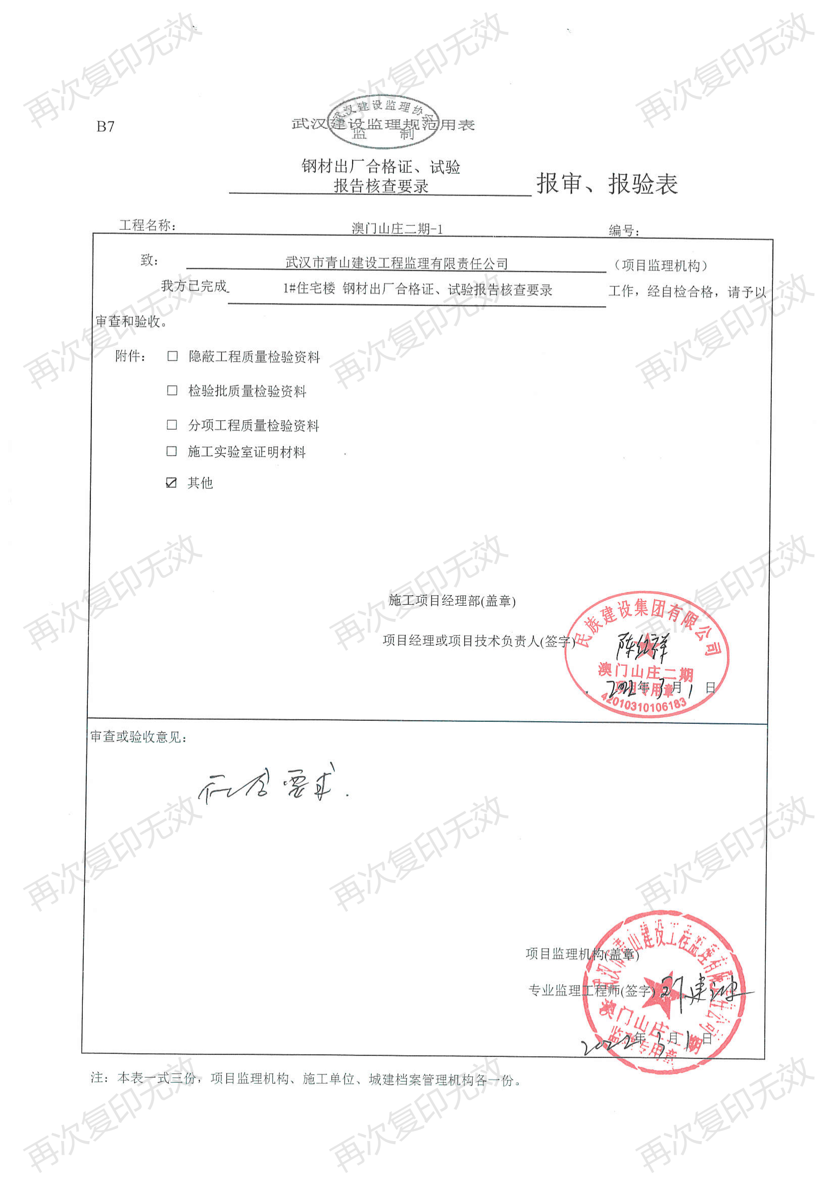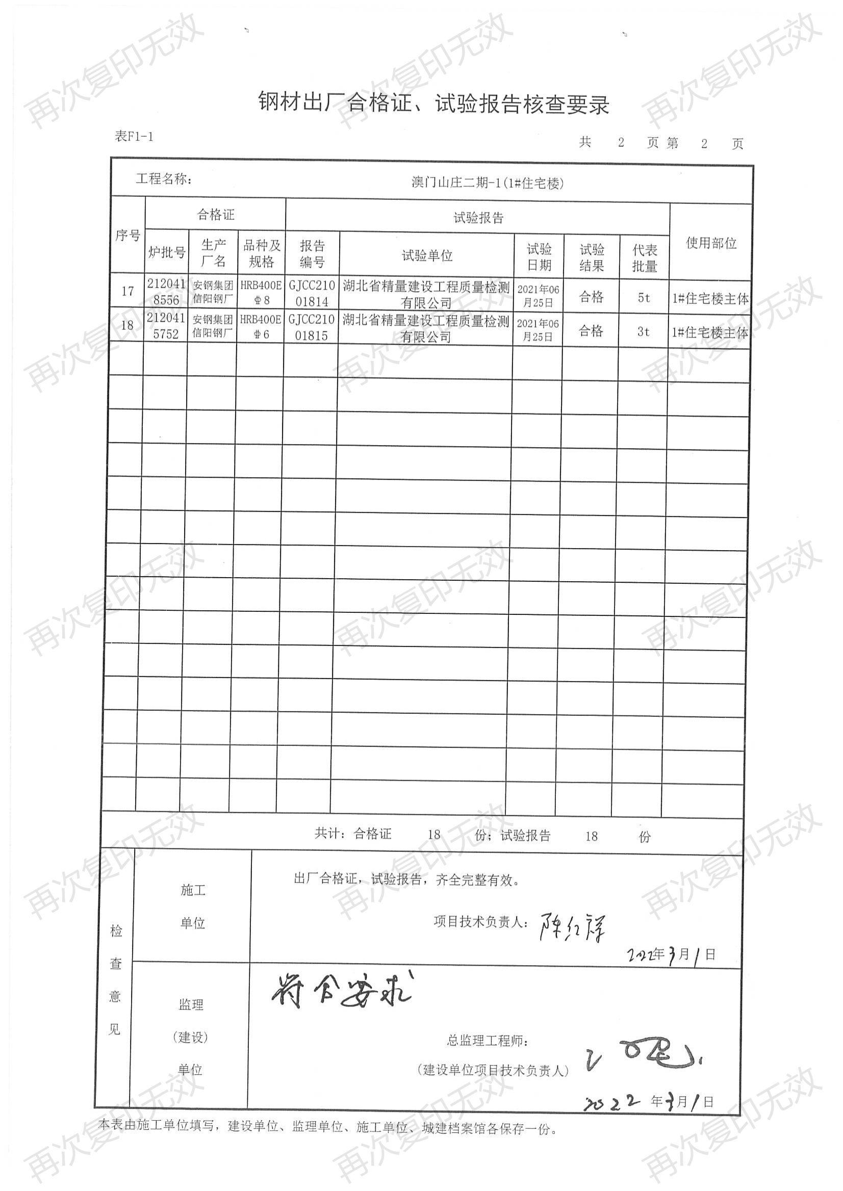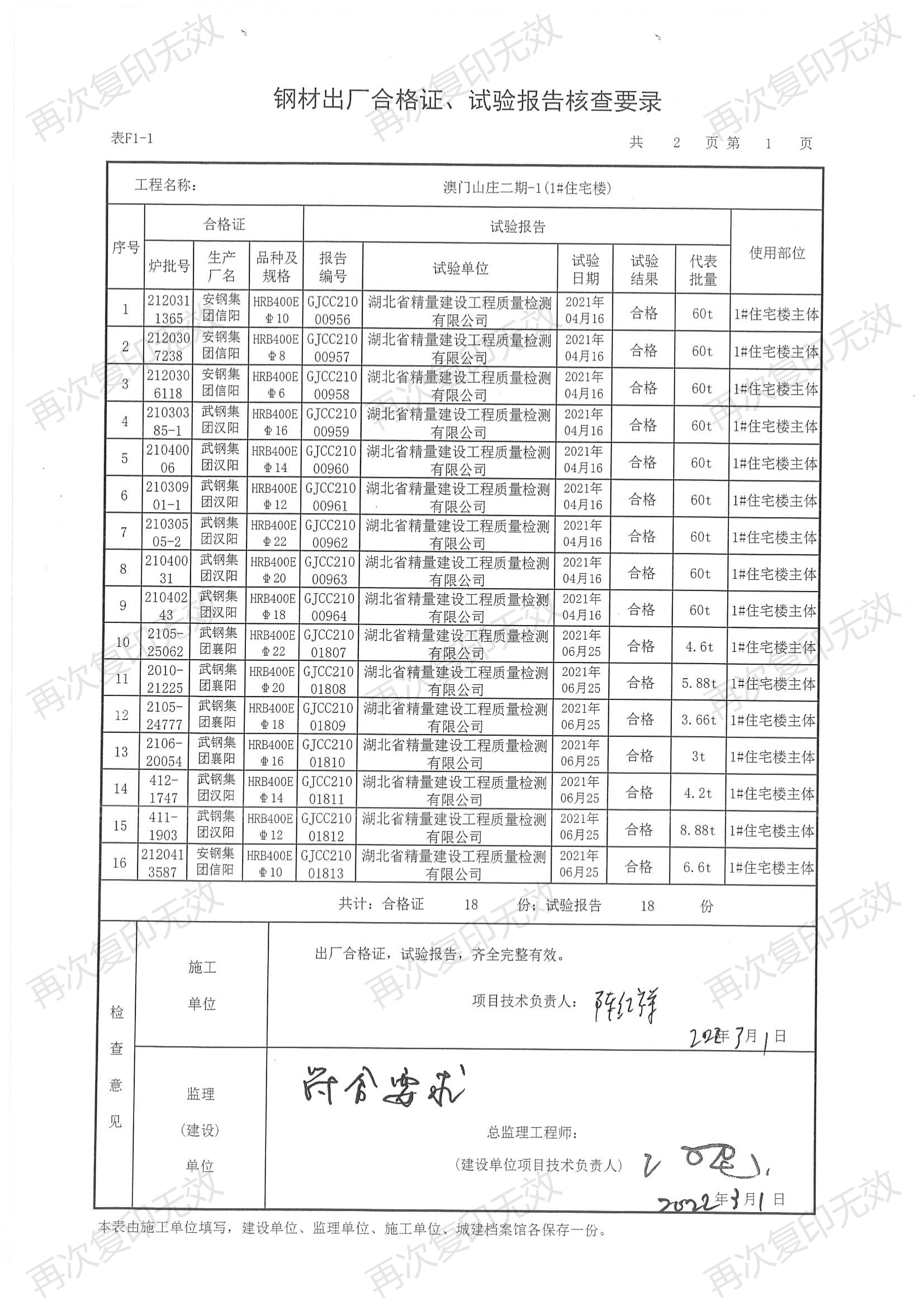 1#住宅楼钢材出厂合格证、试验报告核查要录